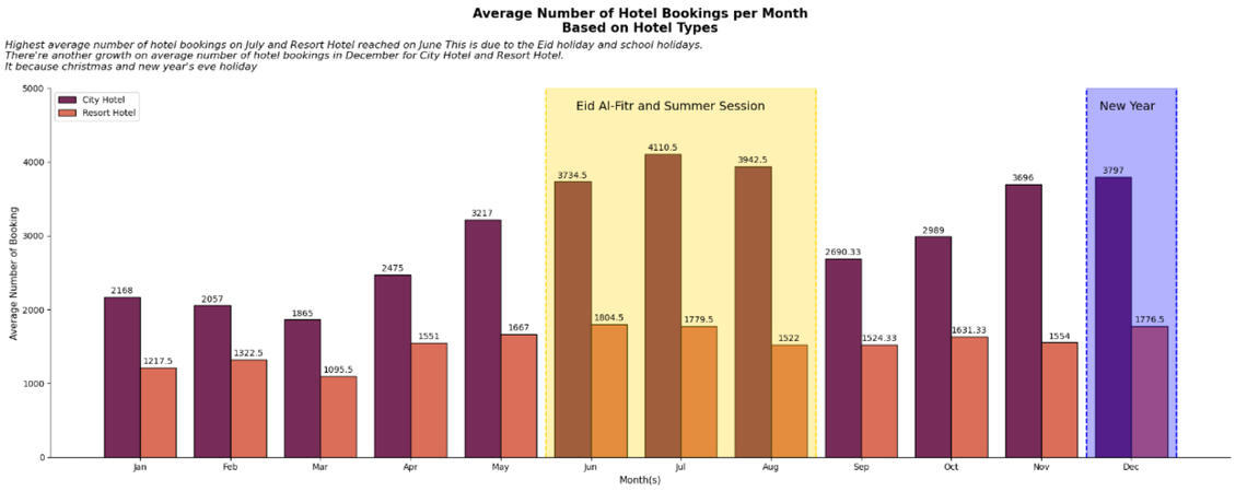 The average number of hotel bookings in July is the highest, while the average number of bookings for resort hotels is highest in June. This is due to the Eid al-Fitr holidays and school holidays. There is also an average increase in the number of hotel bookings in December for both city hotels and resort hotels. This is due to the Christmas holidays and New Year's Eve.